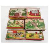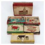 601 PLASTICVILLE 6 KITS, CHURCH,STATION,DAIRY BARN,ANIMALS,FARM BLDGS & CATTLE PEN, OB, N.N.C.