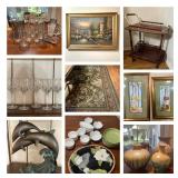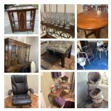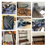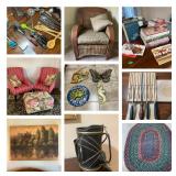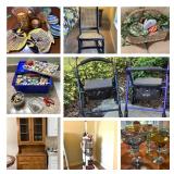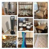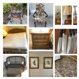 Lots of household items including Lenox Holiday dishes, king bed, twin beds, sofa, chairs, rugs, assistive devices, kitchen items and more.