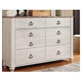 - Rustic design elements are apparent in the strong lines of the raised panel doors and hand-applied, antiqued white sanded and distressed finish.