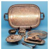 16 - Silverplate Lot - Serving Trays Butter Dish Cream Silverplate Lot - Serving Trays Butter Dish Cream Sugar - Sterling Silver Shaker Condition: tarnished Large tray is 22.75" wide Shipping Method: Standard 5 Pounds or More Weight (#s): 10 Weight (Ozs): 0