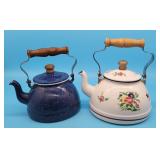 32 - 2 Enamelware Tea Kettles Blue Speckle Agate Floral 2 Enamelware Tea Kettles Blue Speckle Agate Floral Condition: some rust and a few dings here and there, please see photos blue tea pot is 6.25" tall, white kettle is 9" tall Shipping Method: Standard 5 Pounds or More Weight (#s): 6