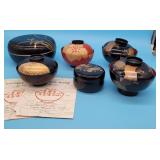 36 - Lot of Japanese Laquerware Bowls & Jars, Coasters Lot of Japanese Laquerware Bowls & Jars, Coasters Red Black Gold Condition: overall good condition, please see photos 0 Shipping Method: Standard 5 Pounds or More Weight (#s): 5 Weight (Ozs): 0