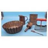 48 - Lot of Tin Kitchenware Mold Sifter Chopper Scoop M Lot of Tin Kitchenware Mold Sifter Chopper Scoop Measure Button Hook Green Red Handle Condition: overall good condition, please see photos mold is 8" dia, measure is 4.75" tall Shipping Method: Standard 4 Pounds or Less Weight (#s): 4 Weight (Ozs): 0