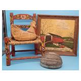 51 - Folk Art Chair, Corn Husk Chicken, Food Mold, Cove Folk Art Chair, Corn Husk Chicken, Food Mold, Covered Bridge Art Condition: Good to fair condition. 0 Shipping Method: First Class - Free Weight (#s): 0 Weight (Ozs): 0