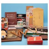Man Cave Items – Shaving Kit, Hunting Sportsman Calendar, Mobile Oil Scarf, Cities Service Flags, Chemical Leman Tank Lines Employee Collectibles, Auto Advertising, Auto & Motorcycle Users Manuals and Repair Guides, Rajah Reading License Plate, Bottle Openers, Bottles, Metal Beer Sign, Estate Pipes, Tobacco Collectibles Camel Matchbooks, 1910 Recruit Tobacco Cards, Metal Lizard Pipe, Hot Rod Magazines, Adult Playboy Model Signed Photos, Men’s Magazines and Playing Cards, Tokens, German Road Signs, Golf Clubs of all kinds, Antique Wood shaft and others, Pocket Knives.