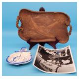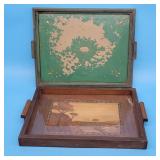 812 - Vintage Wood Inlay Serving Tray & Reverse Painted Vintage Wood Inlay Serving Tray & Reverse Painted Glass Tray Condition: Good to fair condition. 13" by 17". Shipping Method: First Class - Free Weight (#s): 0 Weight (Ozs): 0