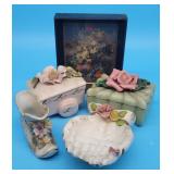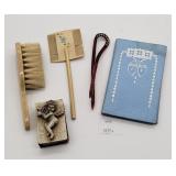37 - Limoges Hair Receive Roses, Blue & White Porcelain Limoges Hair Receive Roses, Blue & White Porcelain Ginger Jar, Moriage Wishing Well, Occupied Japan Mini Teapot Condition: good overall condition, please see photos ginger jar is 4.75" tall Shipping Method: First Class - Free Weight (#s): 0 Weight (Ozs): 0