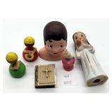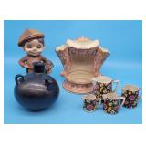 39 - Japan Steak House Bowls, Saki Set, Carved Desk Ink Japan Steak House Bowls, Saki Set, Carved Desk Ink Stamp Set, Asian Vase, Carved Stand Condition: overall good condition, please see photos steak house bowls are 5" dia, carved stamp figures are 4.5" tall Shipping Method: Standard 5 Pounds or More Weight (#s): 7 Weight (Ozs): 0