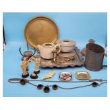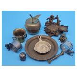 806 - Solid Brass Mortar & Pestle, Metal Cherub Stand, P Solid Brass Mortar & Pestle, Metal Cherub Stand, Pewter Dog & Frog Napkin Rings, Brass Apple Jar, Brass Tray, Cast Iron Cameo Pan, STerling SIlver Shaker Condition: good overall condition, please see photos 0 Shipping Method: First Class - Free Weight (#s): 0 Weight (Ozs): 0