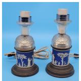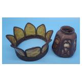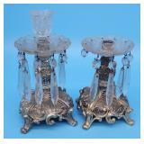 803 - Pair Ornate Metal Candle Holders, Amber Glass Crue Pair Ornate Metal Candle Holders, Amber Glass Cruet Castor Set Wallace & Sons Silver Soldered Holder Condition: Good overall condition, please see photos cruet set is 5.25" tall, Candleholders are 6" tall Shipping Method: Standard 4 Pounds or Less Weight (#s): 4 Weight (Ozs): 0
