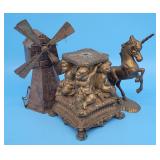 808 - Antique Lamp Base w Cherubs, Brass Unicorn Figurin Antique Lamp Base w Cherubs, Brass Unicorn Figurine Condition: Good to fair condition. 7" by 6". Shipping Method: Standard 5 Pounds or More Weight (#s): 9 Weight (Ozs): 0