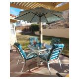 NICE PATIO SET WITH 4 CHAIRS, CUSHIONS, UMBRELLA