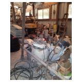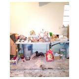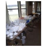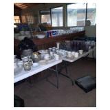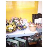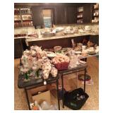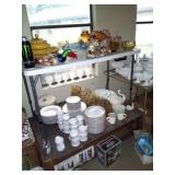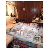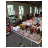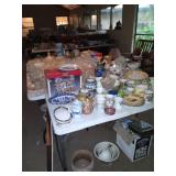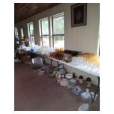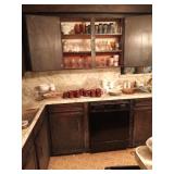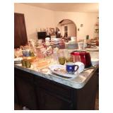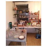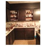 Inside is full of glassware,depression glass,crystal,milk glass, Fenton,art glass,moon and stars cannisters,old jars, pyrex,corning ware, china, glasses,platters,cookie jars, Fitz and Floyd, pots and pans,kitchen items,flatware etc.