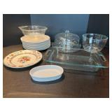 - Lot # 33 - Pyrex Baking Dish, Glass Cake Stand, Misc. Plates & Glass Bowls