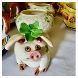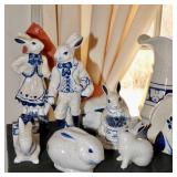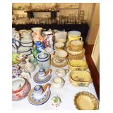Assorted collection of: Tea cups and saucers, platters, pitchers, candlesticks, serving platters, serving bowls, Including: Imari ,Rose medallion, Johnson brothers, Wedgewood, Italian pottery, Royal Doulton Large collection of vintage Dedham pottery including rabbit figurines, pitcher, large bowl, large rabbit clock, tri fold cheese and cracker set and “Ruth” commemorative plate. Lenox china vase Large select collection of vintage Mary Hadley pottery including Christmas platter, large bowl, large pitcher, large tea cup, small dishes and large serving bowl with decorative horse. Porcelain Figurines include: Lladro, Hummel, Ansley, and Spode Large selection of antique platters, dishes, serving sets. Louisville Stoneware – Made in Kentucky – Elongated serving platter with decorative fish imprint. Salmon Falls Pottery candlesticks and large decorative vase.