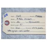 407. H. & R. – Mod. Hunter – 22 Cal. Double Action Revolver – w/4” Barrel w/Front & Rear Sights – Blued Finish – w/Checkered Wood Grips