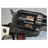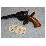 23. A. Uberti – Mod. 1873 Cattleman Thunderer – 44 S&W Spl. Cal. Single Action Revolver – w/4 ¾” Barrel w/Blade Front Sight – Case Colored/Blued Finish – w/Birds Head Smooth Wood Grips – As New w/Factory Box & Lock