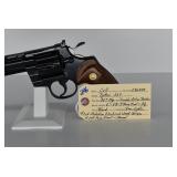 52.    Colt – Mod. Python – 357 Mag. Cal. Double Action Revolver – w/6” Barrel w/Ramp Front & Adj. Rear Sights – Blued Finish – w/Colt Medallion Checkered Wood Grips – New w/Factory Box & Manuals