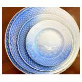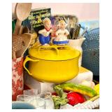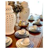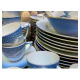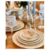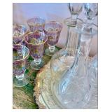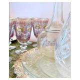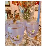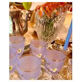 FOR YOUR NEXT GATHERING Vintage barware abounds – decanters, ice buckets, martini pitcher, ruby glass and gold liqueur set, coasters, cocktail and wine glasses including a fine set of sky blue hand painted wine glasses, serving trays; a full beautiful set of pale blue Bing and Grondahl seagull pattern china, Bavarian, American, and classic white china, blue and white Danish china, lovely small sets of themed china, vintage stoneware, painted pottery pieces from Italy, Mexico, and Portugal, copperware, silver tea service and tray, handmade wood serving pieces, flatware set, crystal and glassware entertaining pieces, silver and gold rimmed sets of glasses, decorative covered casseroles, bake ware, enamelware & kitchen linens.