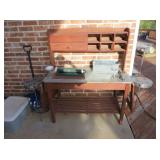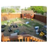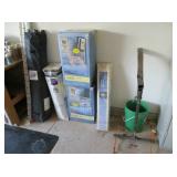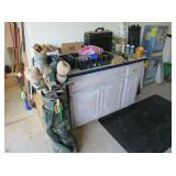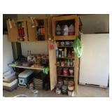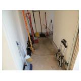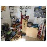 deck boxes, wheelbarrow, ladders, camping chairs, metal arbor, gas blower, carpet shampooers, tons of garden and household chemicals, kitchen cabinets, appliance dolleys, portable water heater, pop up gazebo, impact drill, jigsaw, metal storage cabinets,