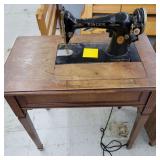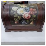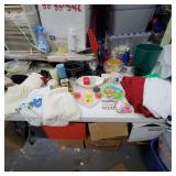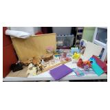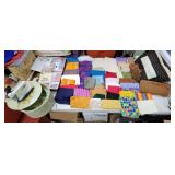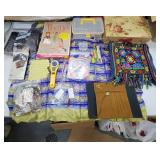 - Lot # 63 - Misc. Fabric, crafting items, crochet hooks, vintage sewing box, quilting items, small iron, and more