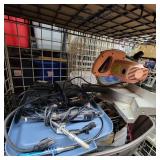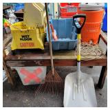 - Lot # 143 - Misc. Outdoor including mop bucket, rake, shovel, igloo water cooler, blue recycle bin, dust pan, and dog wire cable