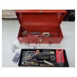 - Lot # 23 - Tool Box with Misc. Tools including Jigsaw blades, Electrical tape, Handheld Nut Driver, and Misc. Hardware.