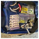 - Lot # 105 - Fishing Lot including Size 12 Waders, Fishing Reel, Some hooks and lures. Also includes water proof bag