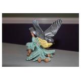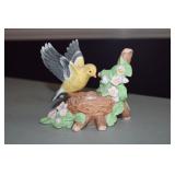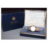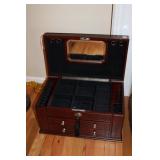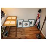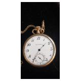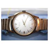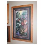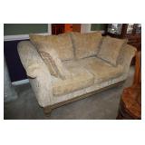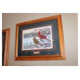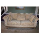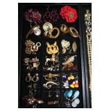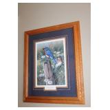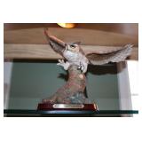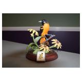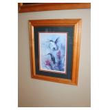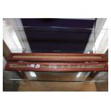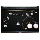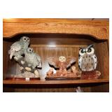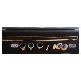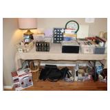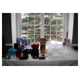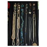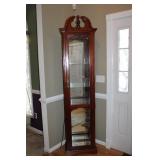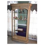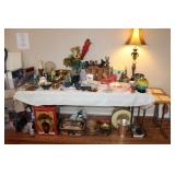 LIVING ROOM/ENTRY/CHECKOUT- GOLD AND COSTUME JEWELRY, LENOX BIRD FIGURINES, GLASS FLUTE, SOUTH BEND POCKET WATCH, VINTAGE GRUEN MEN’S WATCH, LIGHTED DISPLAY SHELF (WOOD & GLASS), SOFA, WALL ART, LIGHTED CURIO CABINET