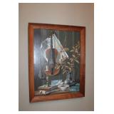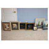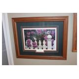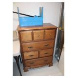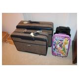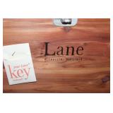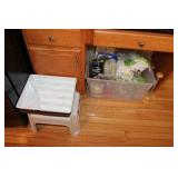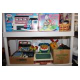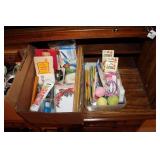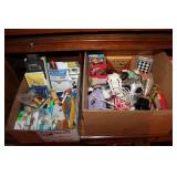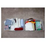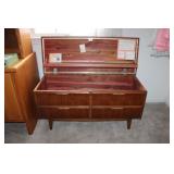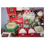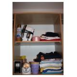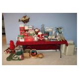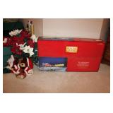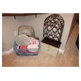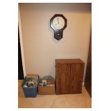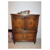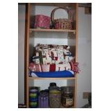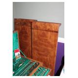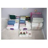 MASTER BEDROOM UPSTAIRS- BEDDING, HOLIDAY, WALL ART, LINENS, HANGERS, ARMOIRE DRESSER, LUGGAGE, TOILETRY, OAK BOOKCASES & DESK UNIT, MCM LANE CHEST, VINTAGE BABY CLOTHES
