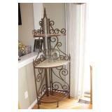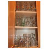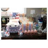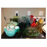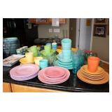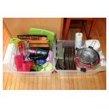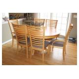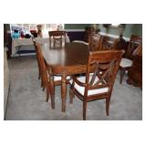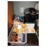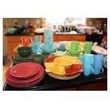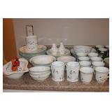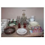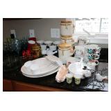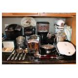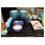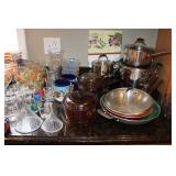 KITCHEN- WOOD DINING TABLE W/6 CHAIRS, CORNER BAKERS RACK, ITS A SMALL WORLD WALL CLOCK, BIRD WALL ART, COLORFUL DISHWARE, KEURIGS, POLISH POTTERY, KITCHEN AID STAND MIXER, LENOX SERVING UTENSILS, SMALL APPLIANCES, COOKWARE, GLASSWARE, BAKEWARE, FLATWARE, PLASTICS