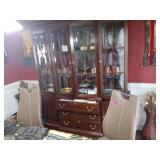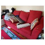 BURGUNDY RUST COLORED CONTEMPORARY SOFA. TWO PIECE WRAP AROUND GLASS & METAL OFFICE DESK. TWO CHERRY HUTCHES.