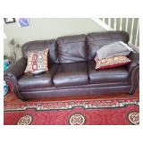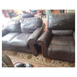 LOVELY FURNISHINGS TO INCLUDE BROWN LEATHER SOFA, LOVESEAT AND MATCHING RECLINER. ROUND METAL TABLES. PAIR OF MATCHING MULTICOLOR FLORAL CHAIRS.