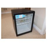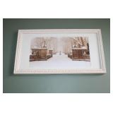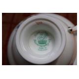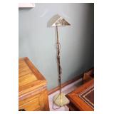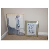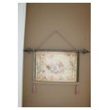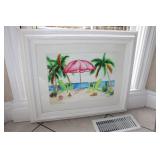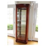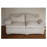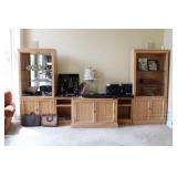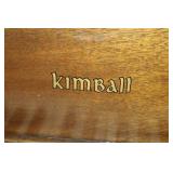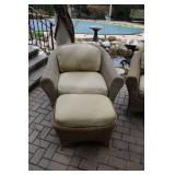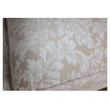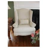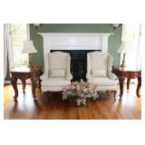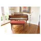 PIANO ROOM- LIGHTED CURIO CABINET, APARTMENT BABY GRAND KIMBALL PIANO, WALL ART, WROUGHT IRON DECORATIVE MUSIC STAND. THOMASVILLE CREAM FLORAL SOFA, 2 CREAM WINGBACK CHAIRS, 2 END TABLES, LAMPS, FIREPLACE SCREEN