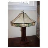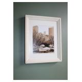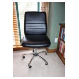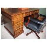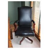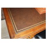 DEN- SMALL AREA RUG, RUSTIC CABINET, LAMPS, BOOKS, MEDIA, CENTRAL PARK FRAMED PHOTOS, 2 LEATHER DESK CHAIRS, LEATHER TOP WOOD DESK, OFFICE SUPPLIES, BINOCULARS