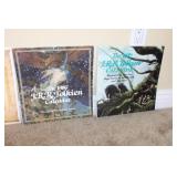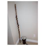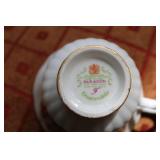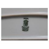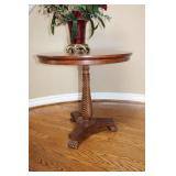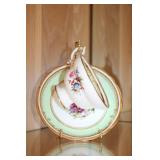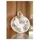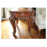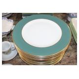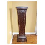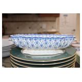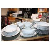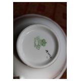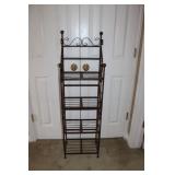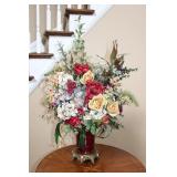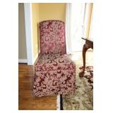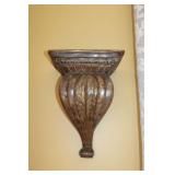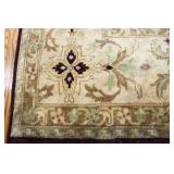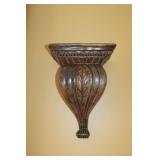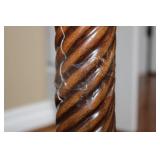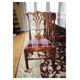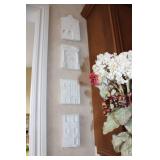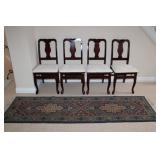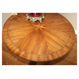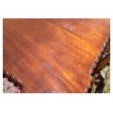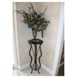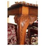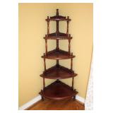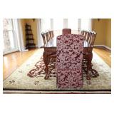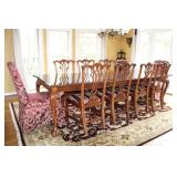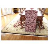 DINING ROOM- BEAUTIFUL DINING TABLE W/8 WOOD CHAIRS & 2 UPHOLSTERED CHAIRS, BEAUTIFUL AREA RUG, 5 TIER CORNER WOOD SHELF, 2 DECORATIVE CERAMIC (PLASTER) WALL SHELVES, PLANT STAND, FLORAL ARRANGEMENT