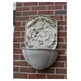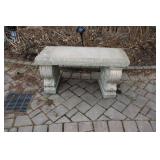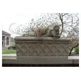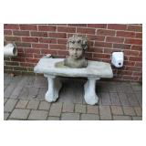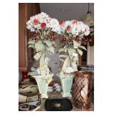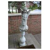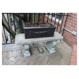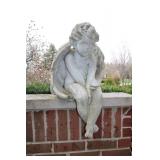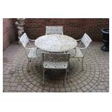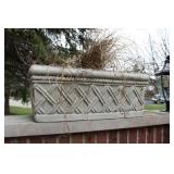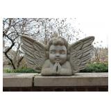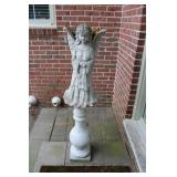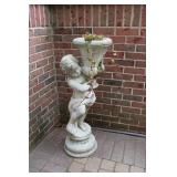 PATIO OFF DINING ROOM- WHITE WROUGHT IRON TABLE W/4 CHAIRS, CEMENT ANGELS, PLANTER BOXES, CEMENT BENCH, CEMENT PLANT STANDS