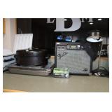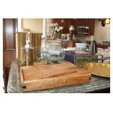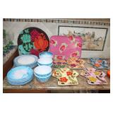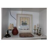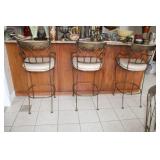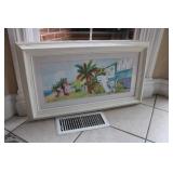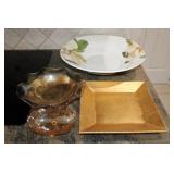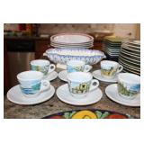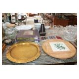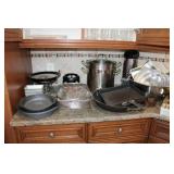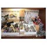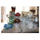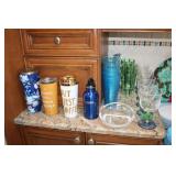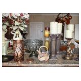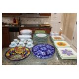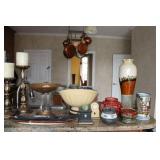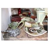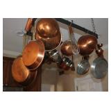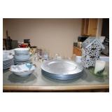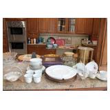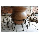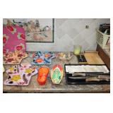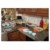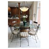 KITCHEN- DECORATIVE PLANT STAND, GLASS TOP ORNATE BASE DINING TABLE W/6 METAL CHAIRS, 3 METAL BAR CHAIRS, 3 STOOLS, DECOR, POTTERY, COP R CHEF COPPER COOKWARE, POTTERY BARN BOWLS, COPELAND FLEUR-DE-LIS SERVING BOWL, ESPRESSO SET, JANIE GROSS GARDEN PARTY PLATES,MAYER CHINA CHINA DINNER PLATES, TUTTO BENE ITALIAN MUGS, TABLETOPS GALLERY MISTO PLATES, LAURIE GATES PASTA BOWL, TABLETOPS GALLERY CHRISTMAS CAROL PLATTERS, LAUREL BURCH PRIMORDIAL DREAM MUGS, GLASSWARE, WOOD PLATTERS, ORIENTAL RUG COASTERS, BAKEWARE, REED & BARTON FLATWARE, UTENSILS, PLASTIC BOWLS & PLATES, WALL CLOCK, DECORATIVE SHELF, COASTAL WALL ART, 2 NIB GUILLERMO FORCHINO MODEL ‘MILITARY JEEP’
