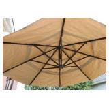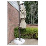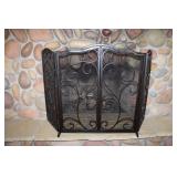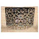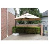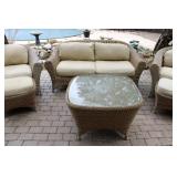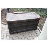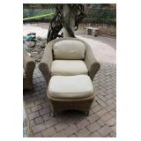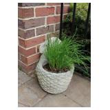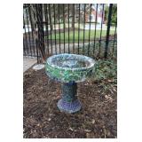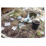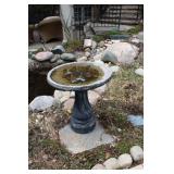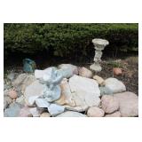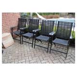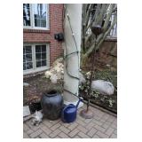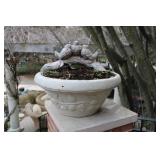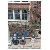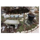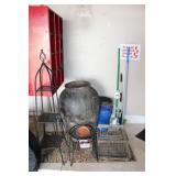 BACKYARD-4 FOLDING METAL CHAIRS, CEMENT PLANTERS, BLACK WROUGHT IRON BENCH, WICKER FURNITURE, DECK BOX, GARDEN ART, CEMENT BOX, BIRD BATH, LARGE PATIO UMBRELLA