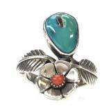 - 3093 VINTAGE ELIAS NAVAJO STERLING SILVER TURQUOISE CORAL FLOWER BYPASS RING