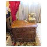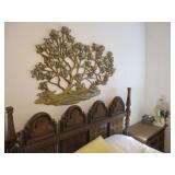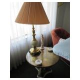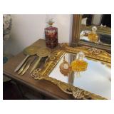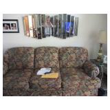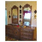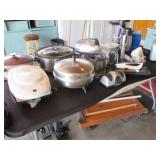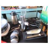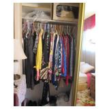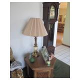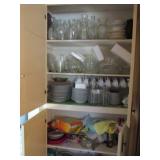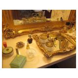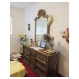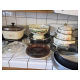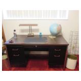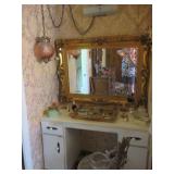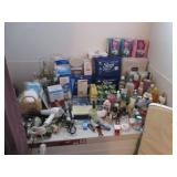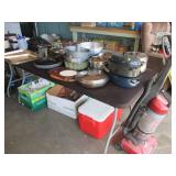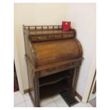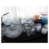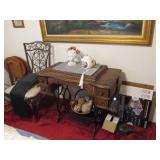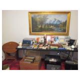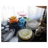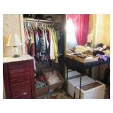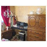 Lots of vintage costume jewelry, furniture including roll top desk, grandmother clock, picture frames, beveled glass mirror, framed artwork and mirror, dishes including Princess House, bell collection, Fenton and carnival glass, Hull pottery vase, kitchenware including Pyrex and jadeite, pots and pans, bed and bath items, vintage clothing, lamps including floor, table, and Fostoria oil lamp, vintage