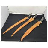 - Lot # 30 - Three Vintage Sharp Wood Horse Handled Swords w/ Leather Sheaths From The Philippines