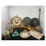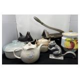 - Lot # 73 - French Fry Cutter, Teapots, Nut Cracker, Casserole Dish & Rooster Dish