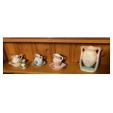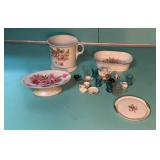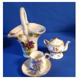 - Violet Themed Porcelain Basket Vase, Small Pitcher, Cup & Saucer