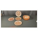 - 5 Miss America Pink Depression Glass. 3 Relish Plates, 1 Dessert Plate & 1 Serving Bowl