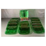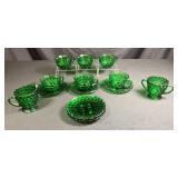 - 6 Vintage 9” Green Glass Dinner Plates, 6 Cups & Saucers, 1 Creamer & Sugar