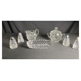 - 2 Sets Fostoria Glassware Salt & Pepper, 1 Sugar & Creamer, 1 Oval Serving Dish