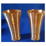 - 2 Vintage Marigold Thin Ribbed Irridescent Fluted Carnival Glass Vases