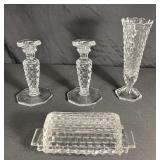 - Set Fostoria Glassware Candleholders,1 Vase, 1 Butter Dish