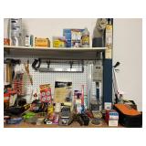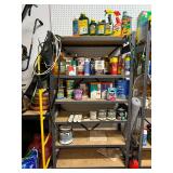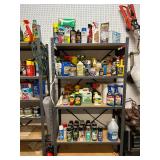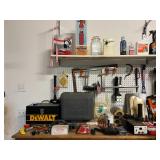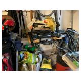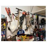 Hand tools; metal shelving; Front Gate misting fan; patio umbrella; Ryobi tiller; side-by-side garage refrigerator; XL Kenmore upright freezer; golf clubs; Shop-Vac; Ryobi circular saw; Bissell garage pro shop vacuum; ladders;